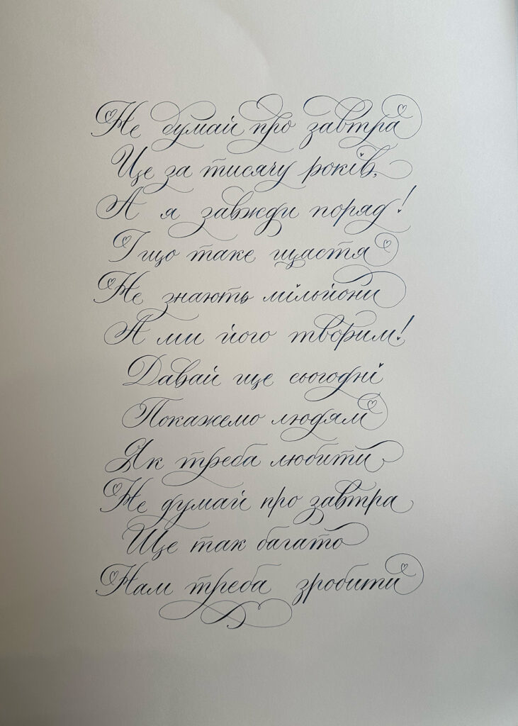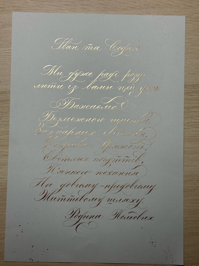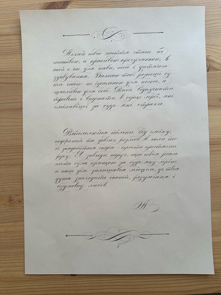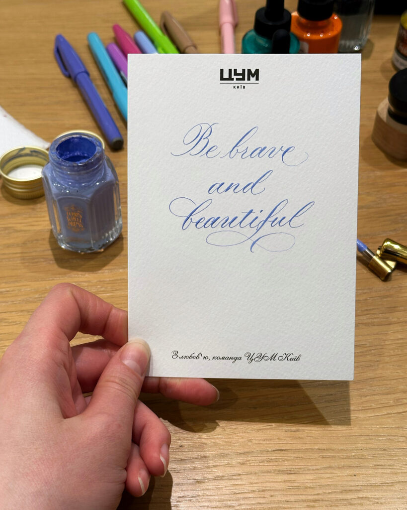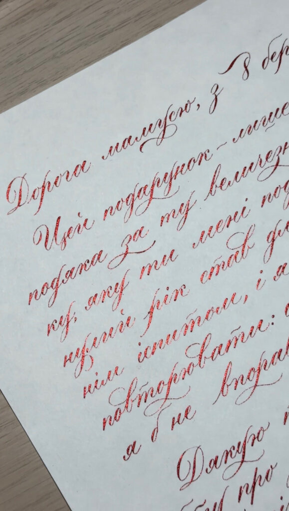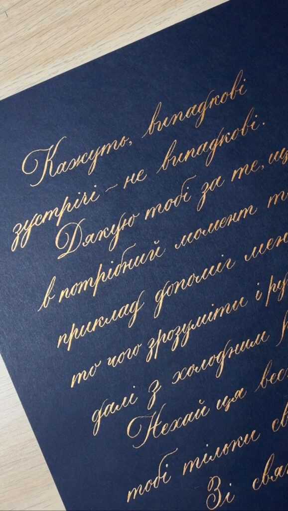 Мені дуже сподобався курс. Я давно займаюся акварельним живописом, часто малюю листівки та періодично їх друкую. І раніше мої літери на цих листівках були не такі ідеальні. Круто, що завжди можна прийти до студії та позайматися каліграфією в дружній атмосфері, вдома не завжди вистачає часу на це.
